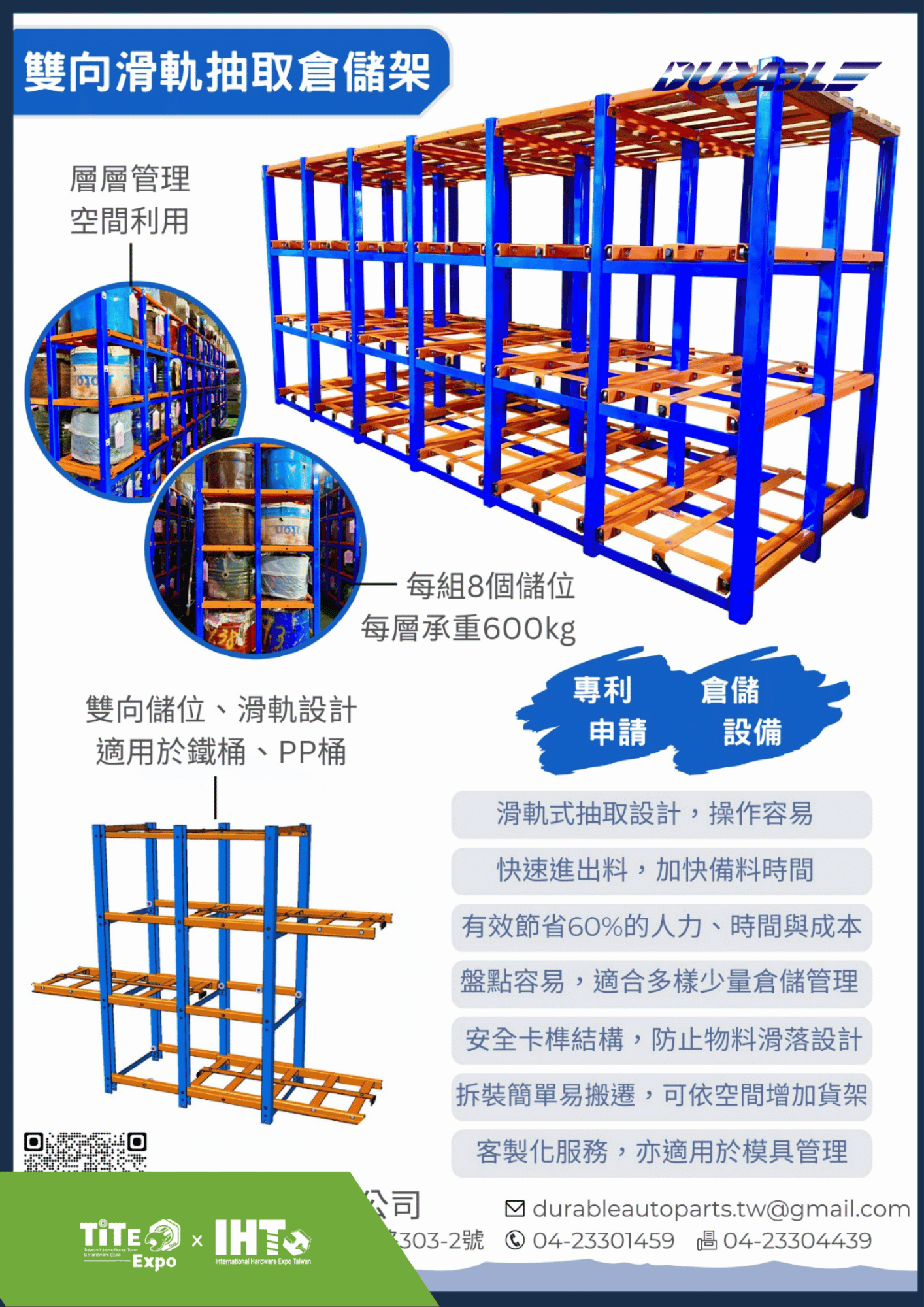 詳細內容Bi-Directional Slide-Out Storage Rack — The Optimal Solution for Efficient Warehouse Management In modern warehouse management, maximizing space utilization and enhancing operational efficiency are essential. The Bi-Directional Slide-Out Storage Rack features a patented design that combines slide-out access with tiered storage management, ensuring smoother and more organized warehouse operations. Product Features: - **Bi-directional sliding design for flexible access** The shelves can be pulled out from both sides, allowing operators to access items from different directions, greatly improving workflow efficiency. - **High load capacity, safe and reliable** Each unit includes eight storage positions, with each layer supporting up to 600 kg. The sturdy and durable structure is suitable for a variety of storage requirements. - **Save 60% on labor and time costs** The slide-out mechanism accelerates material retrieval and inventory checks, reducing unnecessary handling and increasing overall productivity. - **Lock-in structure for secure storage** Safety latches effectively prevent materials from slipping, ensuring the safety of both goods and personnel. - **Modular design and easy installation** Featuring a modular structure, the racks can be flexibly expanded as needed. Simple installation and disassembly make it adaptable to different warehouse environments. - **Customizable for diverse industries** Tailored to meet various industry needs, it’s ideal for factories, logistics centers, warehouse management, and even mold storage, maximizing space efficiency. Choose the Bi-Directional Slide-Out Storage Rack to make your warehouse management more efficient, safer, and more flexible!